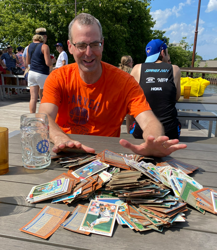 Anyway around the time of that conversation about my death, a day or two on one side or another of it, I actually ventured outside of the house. For over two years I have barely done that at all except to take my dogs around the block to wait for them to shit. My friend Dan Epstein was in town, and he included me in a group invite to a bar with an outdoor patio. I liked that it would be outdoors. Also, I figured if there was ever a gathering where one could bring a sack of old baseball cards (a subset of a larger sack of doubles from my recent windfall), it was that one. Dan, as I hope you know, is, in addition to being a great music writer, the bard of 1970s baseball. I first met him at a bookstore appearance for his definitive work on 1970s baseball, Big Hair and Plastic Grass.