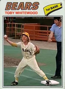 Not much is shown of Toby’s playing abilities in the first film, but in Breaking Training he blossoms into arguably the team’s second-best player, after Kelly. In the game in the Astrodome, he singles in both of his at-bats, the second of those hits sparking the big last-inning comeback. He also scores a run, and he records the most rousing put-out of the game, tagging out a Toro who falls for the ol’ hidden ball trick. (This trick, which is denigrated by the Toros’ coach as a “cheap cotton-picking faggot trick,” is predicated on one of the more noticeable of sequel’s many departures from standard little league rules, which don’t allow for runners to lead off, but then again with decidedly elongating and pubescent figures such as the sequelized versions of Kelly, Ogilvie, and Rudi, perhaps the Bears have somehow moved en masse and without explanation out of little league to Babe Ruth league.) The whole trick plays out like an illustration of Toby’s connection to the adult world, the ball that Coach Leak slips into Toby’s glove like an objectification of all the many bits of esoteric knowledge adults have passed along to Toby. Toby, unsurprisingly, handles this new adult-given secret like a pro, poker-facing the Toros runner into taking a lead.